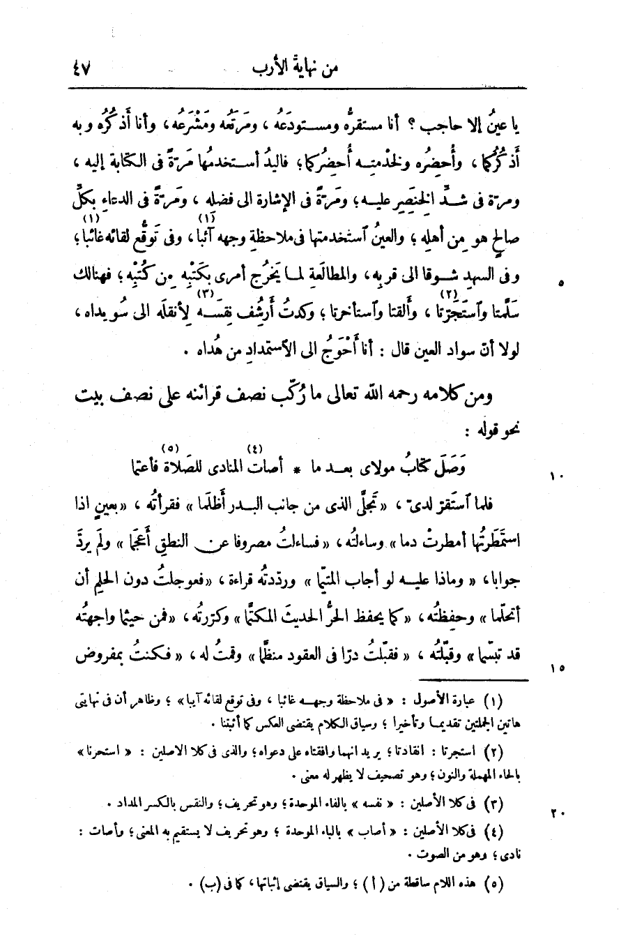 فلما استقرّ لدىّ، «تجلّى الذى من جانب البدر أظلما» فقرأته، «بعين اذا استمطرتها أمطرت دما» وساءلته، «فساءلت مصروفا عن النطق أعجما» ولم يردّ جوابا، «وماذا عليه لو أجاب المتيّما» وردّدته قراءة، «فعوجلت دون الحلم أن أتحلما» وحفظته، «كما يحفظ الحرّ الحديث المكتّما» وكرّرته، «فمن حيثما واجهته قد تبسّما» وقبّلته، «فقبّلت درّا فى العقود منظّما» وقمت له، «فكنت بمفروض