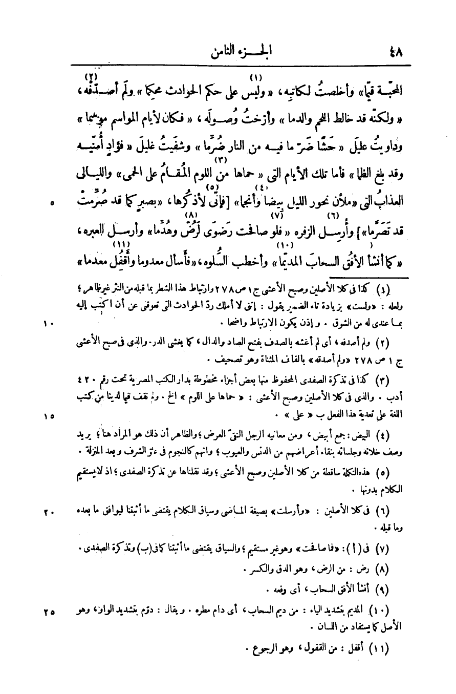 المحبّة قيّما» وأخلصت لكاتبه، «وليس «1» على حكم الحوادث محكما» ولم أصدّفه «2» ، «ولكنّه قد خالط اللحم والدما» وأرّخت وصوله، «فكان لأيام المواسم موسما» وداويت عليل «حشا ضرّ ما فيه من النار ضرّما» وشفيت غليل «فؤاد أمنّيه وقد بلغ الظما» فأما تلك الأيام التى «حماها من «3» اللوم المقام على الحمى» والليالى العذاب التى «ملأن نحور الليل بيضا «4» وأنجما» [فإنّى «5» لأذكرها، «بصبر كما قد صرّمت قد تصرّما» ] وأرسل «6» الزفره «فلو «7» صافحت رضوى لرضّ «8» وهدّما» وأرسل العبره، «كما أنشأ «9» الأفق السحاب المديّما «10» » وأخطب السلوه، «فأسأل معدوما وأقفل «11» معدما»
