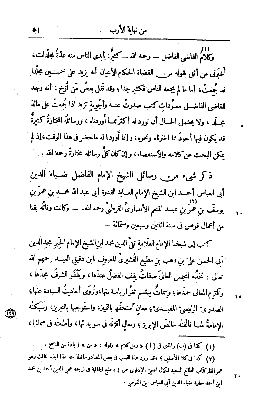 أبى العباس أحمد ابن الشيخ الإمام العابد القدوة أبى عبد الله محمد بن عمر بن يوسف بن عمر «2» بن عبد المنعم الأنصارىّ القرطبىّ رحمه الله،- وكانت وفاته بقنا من أعمال قوص فى سنة اثنتين وسبعين وستمائة- كتب إلى شيخنا الإمام العلّامة تقىّ الدين محمد ابن الشيخ الإمام الحبر مجد الدين أبى الحسن علىّ بن وهب بن مطيع القشيرىّ المعروف بابن دقيق العيد رحمهم الله تعالى: تخدم المجلس العالى صفات يقف الفضل عندها، ويقفو الشرف مجدها، وتلتزم المعالى حمدها؛ وسمات يبتسم ثغر الرياسة منها، وتروى أحاديث السيادة عنها؛ الصدرىّ الرئيسىّ المفيدىّ؛ معان استحقّها بالتمييز، واستوجبها بالتبريز، وسبكته الإمامة لها فألفته خالص الإبريز؛ ومعال أقرّته فى سويدائها، وأطلعته فى سمائها،