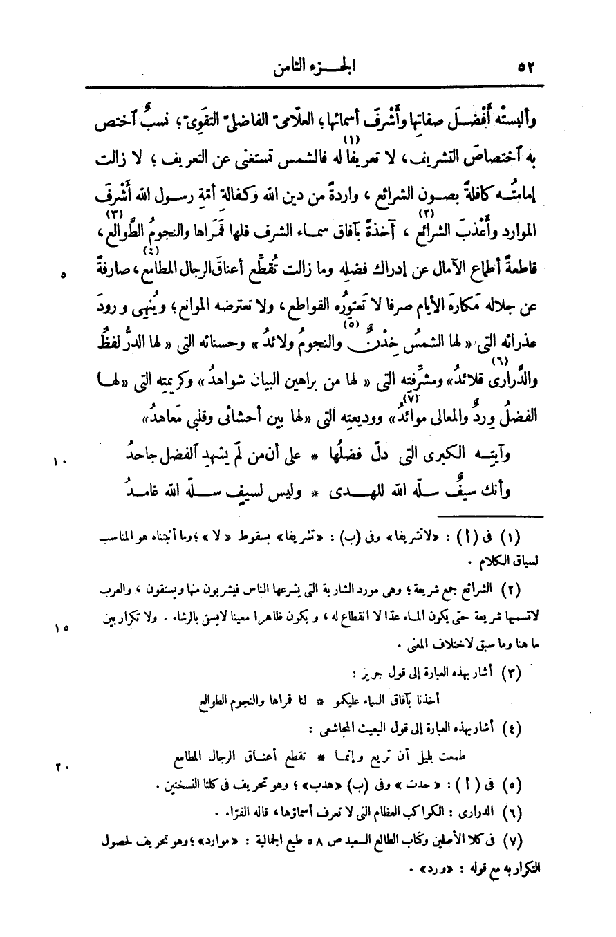 وألبسته أفضل صفاتها وأشرف أسمائها؛ العلّامىّ الفاضلىّ التقوىّ؛ نسب اختص به اختصاص التشريف، لا تعريفا «1» فالشمس تستغنى عن التعريف؛ لا زالت إمامته كافلة بصون الشرائع، واردة من دين الله وكفالة أمّة رسول الله أشرف الموارد وأعذب الشرائع «2» ، آخذة بآفاق سماء الشرف فلها قمراها والنجوم الطّوالع «3» ، قاطعة أطماع الآمال عن إدراك فضله وما زالت تقطّع أعناق الرجال المطامع «4» ، صارفة عن جلاله مكاره الأيام صرفا لا تعتوره القواطع، ولا تعترضه الموانع؛ وينهى ورود عذرائه التى «لها الشمس خدن «5» والنجوم ولائد» وحسنائه التى «لها الدرّ لفظ والدّرارى «6» قلائد» ومشرّفته التى «لها من براهين البيان شواهد» وكريمته التى «لها الفضل ورد والمعالى موائد «7» ووديعته التى «لها بين أحشائى وقلبى معاهد»