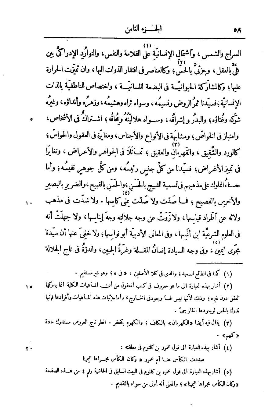 السراج والشمس، واشتمال الإنسانيّة على «1» القلامة والنفس، والتوارد الإدراكىّ بين كلّىّ بالعقل، وجزئىّ بالحسّ «2» ؛ وكالعناصر فى افتقار الذوات اليها، وان تميّزت الحرارة عليها؛ وكالمشاركة الحيوانيّة فى البضعة اللسانيّة، واختصاص الناطقيّة بالذات الإنسانيّة؛ فسيّدنا ثمر الروض ونسيمه، وسواه ثراه وهشيمه، وزهره وأنداؤه، وغيره شوكه وغثاؤه؛ والبدر وإشراقه، وسواه هلاليّته ومحاقه؛ اشتراك فى الأشخاص، وامتياز فى الخواصّ؛ ومشابهة فى الأنواع والأجناس، ومغايرة فى العقول والحواسّ؛ كالورد والشّقيق، والقهرمان «3» والعقيق؛ تماثلا فى الجواهر والأعراض، وتغايرا فى تمييز الأغراض؛ فسيّدنا من كلّ جنس رئيسه، ومن كلّ جوهر نفيسه؛ وأما حسناء المملوك على مذهبهم فى تسمية القبيح بالحسن، والحسن بالقبيح، والضرير بالبصير والأخرس بالفصيح؛ فما صدّت ولا صدّت يمنى»