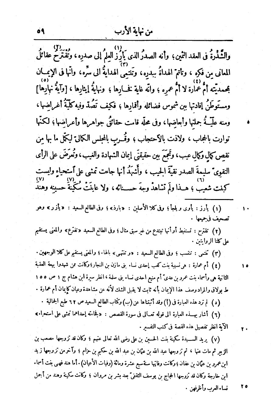 والشّذرة فى العقد الثمين؛ وأنه الصدر الذى يأرز «1» العلم إلى صدره، وتقترح «2» عقائل المعانى من فكره، وتأتمّ الهداة ببدره، وتنتمى «3» الهداية الى سرّه، وانّها فى الإيمان بمحمديّته أمّ عمارة «4» لا أمّ عمره؛ وانّه غاية فخارها؛ ونهاية إيثارها، [وآية نهارها «5» ] ومستوطن إفادتها بين شموس فضائله وأقمارها؛ فكيف تصدّ وفيه كلّيّة أغراضها، ومنه علّيّة جملتها وأبعاضها، وفى محلّه قامت حقائق جواهرها وأعراضها؛ لكنّها توارت بالحجاب، ولاذت بالاحتجاب؛ وقرب بالمجلس الكمالى ليكمّل ما بها من نقص كمال وكمال عيب، وتجمع بين حقيقتى إيمان الشهادة والغيب، وتعرض على الرأى التقوىّ سليمة الصدر نقيّة الجيب، وأشهد أنها جاءت تمشى على استحياء وليست كبنت شعيب «6» ؛ هذا ولم تشاهد وجه حسنائه، ولا عاينت سكينة «7» حسينه وهند «8»