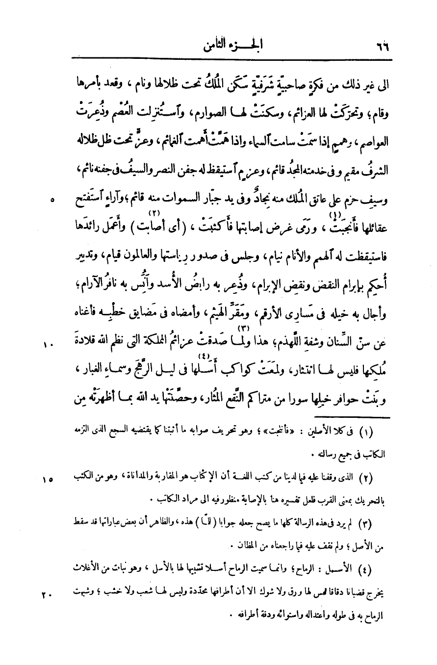 الى غير ذلك من فكرة صاحبيّة شرفيّة سكن الملك تحت ظلالها ونام، وقعد بأمرها وقام؛ وتحرّكت لها العزائم، وسكنت لها الصوارم، واستنزلت العصم وذعرت العواصم، وهمم إذا سمت سامت السماء واذا همّت أهمت الغمائم، وعزّ تحت ظل ظلاله الشرف مقيم وفى خدمته المجد قائم، وعزم استيقظ له جفن النصر والسيف فى جفنه نائم، وسيف حزم على عاتق الملك منه نجاد وفى يد جبّار السموات منه قائم؛ وآراء استفتح عقائلها فأنجبت «1» ، ورمى غرض إصابتها فأكثبت، (أى أصابت «2» ) وأعمل رائدها فاستيقظت له الهمم والأنام نيام، وجلس فى صدور رياستها والعالمون قيام، وتدبير أحكم بإبرام النقض ونقض الإبرام، وذعر به رابض الأسد وأنس به نافر الآرام؛ وأجال به خيله فى مسارى الأرقم، ومقرّ الهيثم، وأمضاه فى مضايق خطبه فأغناه عن سنّ السّنان وشفة اللهذم؛ هذا ولما «3» صدقت عزائم المملكة التى نظم الله قلادة ملكها فليس لها انتثار، ولمعت كواكب أسلها «4» فى ليل الرّهج وسماء الغبار، وبنت حوافر خيلها سورا من متراكم النّقع المثار، وحصّنتها يد الله بما أظهرته من
