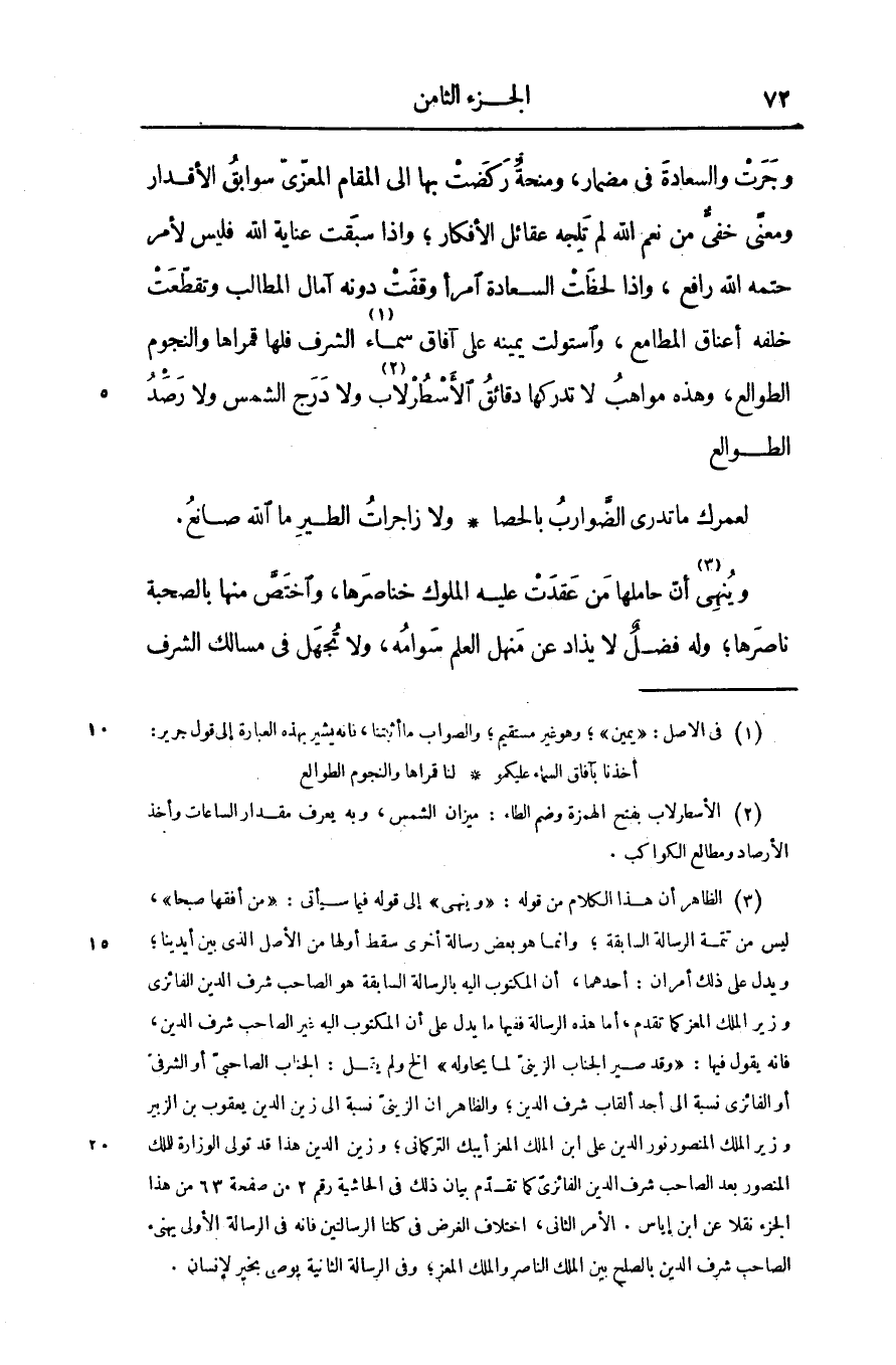 وجرت والسعادة فى مضمار، ومنحة ركضت بها الى المقام المعزّىّ سوابق الأقدار ومعنى خفى من نعم الله لم تلجه عقائل الأفكار؛ واذا سبقت عناية الله فليس لأمر حتمه الله رافع، واذا لحظت السعادة امرأ وقفت دونه آمال المطالب وتقطّعت خلفه أعناق المطامع، واستولت يمينه على آفاق سماء «1» الشرف فلها قمراها والنجوم الطوالع، وهذه مواهب لا تدركها دقائق الأسطرلاب «2» ولا درج الشمس ولا رصد الطوالع