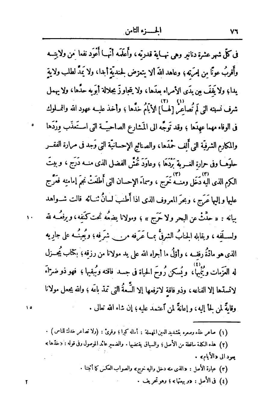 فى كلّ شهر عشرة دنانير وهى نهاية قدرته، وأعلمه أنّها أعود نفعا من ولايته وأقرب عونا من إمرته؛ وعاهد الله ألا يتعرّض لجنديّة أبدا، ولا يمدّ لطلب ولاية يدا؛ ولا يقف بين يدى الأمراء بعدها، ولا يتجاوز بجلالة أبويه حدّها، ولا يهمل شرف نسبته التى لم تصاعر «1» [لها «2» ] الأيّام خدّها؛ وأخذ عليه عهود الله والمملوك فى الوفاء مهما عهدها؛ وقد توجّه الى المشارع الصاحبيّة التى استعذب وردها والمكارم الشرفيّة التى ألف حمدها، والصنائع الإحسانيّة التى وجد فى مرارة الفقر حلوها وفى حرارة الغربة بردها؛ وعاود عشّ الفضل الذى منه درج، وبيت الكرم الذى اليه دخل ومنه «3» خرج، وسماء الإحسان التى أطلعت نجم إمامته فعرّج عليها وإليها عرج، وبحر المعروف الذى اذا أطنب لسان ثنائه قالت شواهد بيانه: «حدّث عن البحر ولا حرج» ؛ ومولانا يضعه تحت كنفه، ويرفعه لله ولسلفه، ويقابله الجناب الشرفىّ بما عرفه من شرفه؛ ويعينه على جاريه الذى هو مادّة رفقه، وأوّل ما أجراه الله على يد مولانا من رزقه؛ بكتاب يجزل له العزمات وينميها «4» ، ويسكن روح الحياة فى جسد فاقته ويبقيها؛ فهو ذو ضرّاء لا تسدّها إلا القناعه، وذو فاقة لا ترفعها إلا السّعة التى تمدّ باعه؛ والله يجعل مولانا وقاية لمن لجأ إليه، وإعانة لمن اعتمد عليه؛ إن شاء الله تعالى.