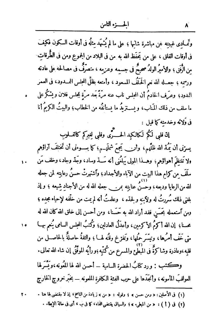 وتمادى غيبته عن مباشرة شانها؛ على ما لم يشهد مثله فى أوقات السكون فكيف فى أوقات القلق، على من يحفظ الله به من فى البلاد من الجموع ومن فى الطّرقات ومن الرّفق؛ والأمير الولد صحيح فى جسمه وعزمه، متصرّف فى مصالحه على عادته ورسمه؛ جعله الله نعم الخلف المسعود، وأمتعه بظلّ المجلس الممدود، فى العمر الممدود؛ وعرف الخادم أن المجلس ناب عنه مرّة بمجلس فلان ويشكر على ما سلف من ذلك المناب، ويستزيد ما يستأنفه من الخطاب؛ والبيت الكريم أنا فى ولائه وخدمته كما قيل: