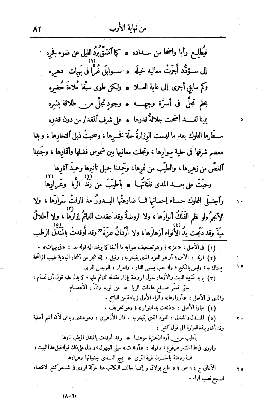 واجتلى المملوك حسناء إحسانها فما ضارعتها البدور مذ فارقت سرارها، ولا الأنجم ولو نظم الفلك أنوارها، ولا الروضة وقد عقدت الغمائم إزارها «4» ، ولا أطلال ميّة وقد دبجت يد الأنواء «5» أزهارها، ولا أردان عزّة «وقد أوقدت بالمندل «6» الرطب