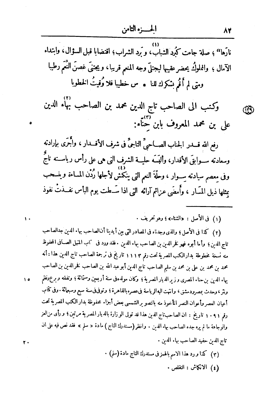 وكتب الى الصاحب تاج الدين محمد بن الصاحب بهاء «2» الدين على بن محمد المعروف بابن حنّاء «3» :
