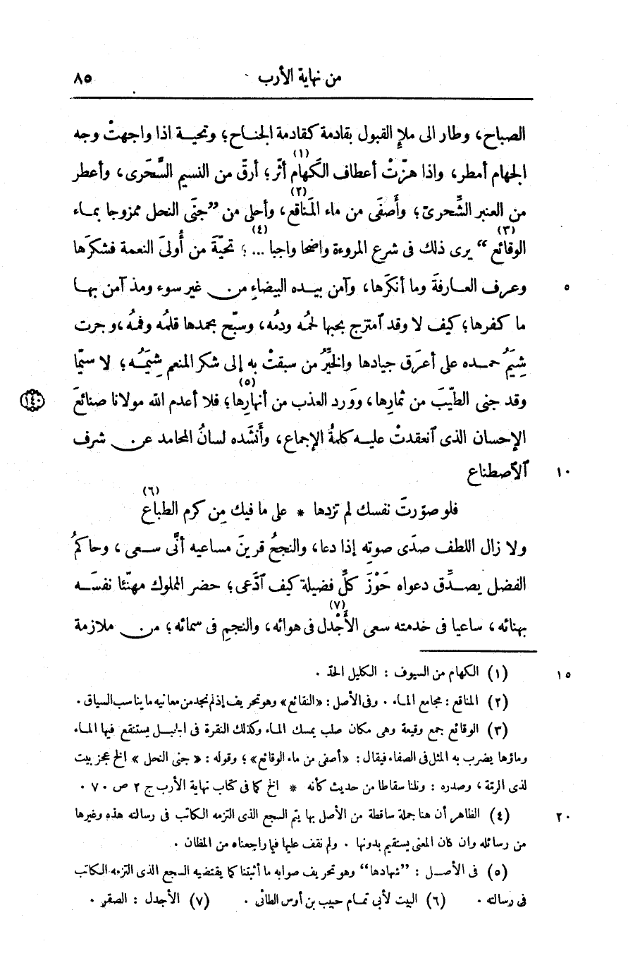 أثّر؛ أرقّ من النسيم السّحرى، وأعطر من العنبر الشّحرىّ؛ وأصفى من ماء المناقع «2» ، وأحلى من «جنى النحل ممزوجا بماء الوقائع «3» » يرى ذلك فى شرع المروءة واضحا واجبا «4» ... ؛ تحيّة من أولى النعمة فشكرها وعرف العارفة وما أنكرها، وآمن بيده البيضاء من غير سوء ومذ آمن بها ما كفرها؛ كيف لا وقد امتزج بحبها لحمه ودمه، وسبّح بحمدها قلمه وفمه، وجرت شيم حمده على أعرق جيادها والخيّر من سبقت به إلى شكر المنعم شيمه؛ لا سيّما وقد جنى الطّيب من ثمارها، وورد العذب من أنهارها «5» ؛ فلا أعدم الله مولانا صنائع الإحسان الذى انعقدت عليه كلمة الإجماع، وأنشده لسان المحامد عن شرف الاصطناع