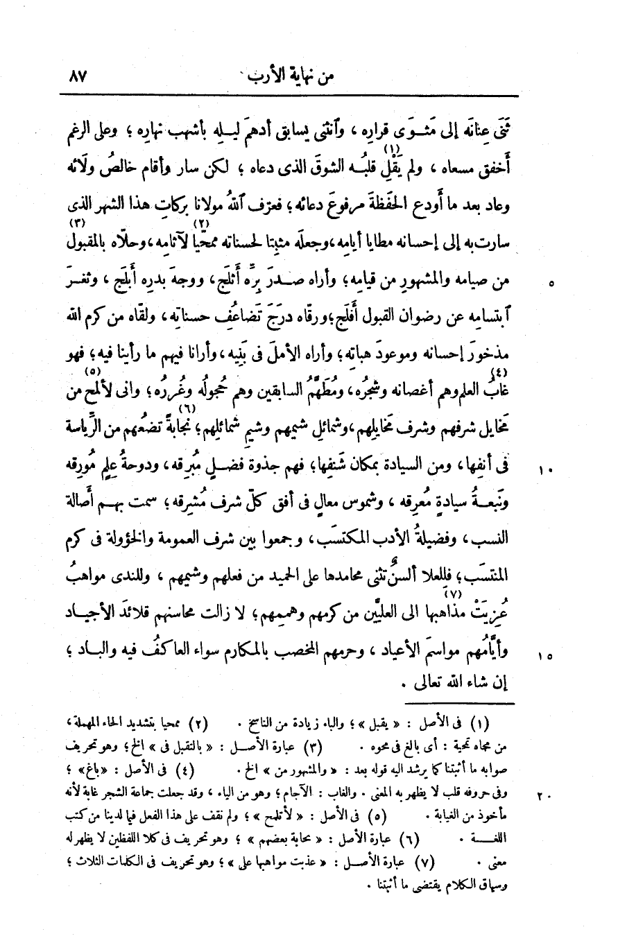 ثنى عنانه إلى مثوى قراره، وانثنى يسابق أدهم ليله بأشهب نهاره؛ وعلى الرغم أخفق مسعاه، ولم يقل «1» قلبه الشوق الذى دعاه؛ لكن سار وأقام خالص ولائه وعاد بعد ما أودع الحفظة مرفوع دعائه؛ فعرّف الله مولانا بركات هذا الشهر الذى سارت به إلى إحسانه مطايا أيامه، وجعله مثبتا لحسناته ممحّيا «2» لآثامه، وحلّاه بالمقبول «3» من صيامه والمشهور من قيامه؛ وأراه صدر برّه أثلج، ووجه بدره أبلج، وثغر ابتسامه عن رضوان القبول أفلج؛ ورقّاه درج تضاعف حسناته، ولقّاه من كرم الله مذخور إحسانه وموعود هباته؛ وأراه الأمل فى بنيه، وأرانا فيهم ما رأينا فيه؛ فهو غاب «4» العلم وهم أغصانه وشجره، ومطهّم السابقين وهم حجوله وغرره؛ وانى لألمح «5» من مخايل شرفهم وشرف مخايلهم، وشمائل شيمهم وشيم شمائلهم؛ نجابة «6» تضعهم من الرّياسة فى أنفها، ومن السيادة بمكان شنفها؛ فهم جذوة فضل مبرقه، ودوحة علم مورقه ونبعة سيادة معرقه، وشموس معال فى أفق كلّ شرف مشرقه؛ سمت بهم أصالة النسب، وفضيلة الأدب المكتسب، وجمعوا بين شرف العمومة والخؤولة فى كرم المنتسب؛ فللعلا ألسن تثنى محامدها على الحميد من فعلهم وشيمهم، وللندى مواهب عزيت مذاهبها «7» الى العليّين من كرمهم وهممهم؛ لا زالت محاسنهم قلائد الأجياد وأيّامهم مواسم الأعياد، وحرمهم المخصب بالمكارم سواء العاكف فيه والباد؛ إن شاء الله تعالى.