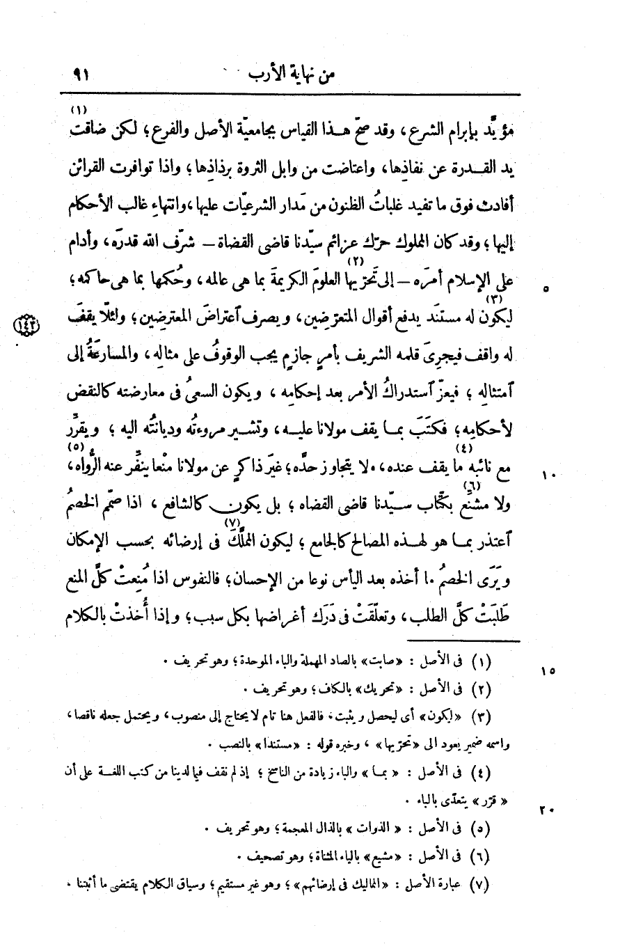 مؤيّد بإبرام الشرع، وقد صحّ هذا القياس بجامعيّة الأصل والفرع؛ لكن ضاقت «1» يد القدرة عن نفاذها، واعتاضت من وابل الثروة برذاذها؛ واذا توافرت القرائن أفادت فوق ما تفيد غلبات الظنون من مدار الشرعيّات عليها، وانتهاء غالب الأحكام إليها؛ وقد كان المملوك حرّك عزائم سيّدنا قاضى القضاة- شرّف الله قدره، وأدام على الإسلام أمره- إلى تحرّيها «2» العلوم الكريمة بما هى عالمه، وحكمها بما هى حاكمه؛ ليكون «3» له مستند يدفع أقوال المتعرّضين، ويصرف اعتراض المعترضين؛ ولئلّا يقف له واقف فيجرى قلمه الشريف بأمر جازم يجب الوقوف على مثاله، والمسارعة إلى امتثاله؛ فيعزّ استدراك الأمر بعد إحكامه، ويكون السعى فى معارضته كالنقض لأحكامه؛ فكتب بما يقف مولانا عليه، وتشير مروءته وديانته اليه؛ ويقرّر مع نائبه «4» ما يقف عنده، ولا يتجاوز حدّه؛ غير ذاكر عن مولانا منعا ينفّر عنه الرّواه «5» ، ولا مشنّع «6» بكتّاب سيّدنا قاضى القضاه؛ بل يكون كالشافع، اذا صمّم الخصم اعتذر بما هو لهذه المصالح كالجامع؛ ليكون المملّك «7» فى إرضائه بحسب الإمكان ويرى الخصم ما أخذه بعد اليأس نوعا من الإحسان؛ فالنفوس اذا منعت كلّ المنع طلبت كلّ الطلب، وتعلّقت فى درك أغراضها بكل سبب؛ وإذا أخذت بالكلام