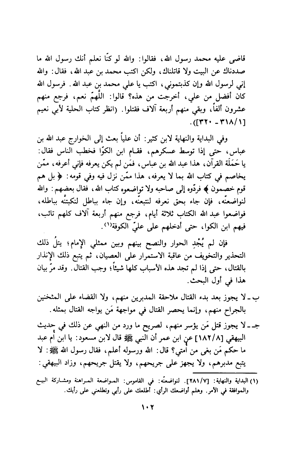 قاضي عليه محمد رسول الله، فقالوا: والله لو كنا نعلم أنك رسول الله ما صددناك عن البيت ولا قاتلناك، ولكن اكتب محمد بن عبدالله، فقال: والله إني لرسول الله وإن كذبتموني، اكتب يا على محمد بن عبدالله. فرسول الله كان أفضل من علي، أخرجت من هذه؟ قالوا: اللهم نعم، فرجع منهم عشرون ألفاً، وبقي منهم أربعة آلاف فقتلوا. (انظر كتاب الحلية لأبي نعيم [1/ 318 ـ 320]).