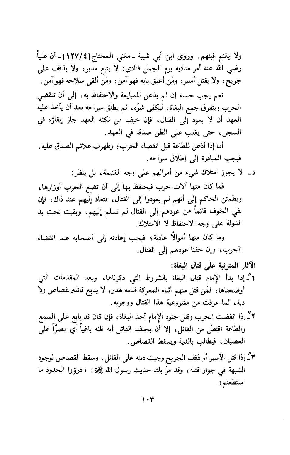 ولا يغنم فيئهم. وروى ابن أبي شيبة ـ مغني المحتاج [4/ 127]ـ أن علياً رضي الله عنه أمر مناديه يوم الجمل فنادي: لا يتبع مدبر، ولا يذفف على جريح، ولا يقتل أسير، ومن أغلق بابه فهو آمن، ومن ألقى سلاحه فهو آمن.
