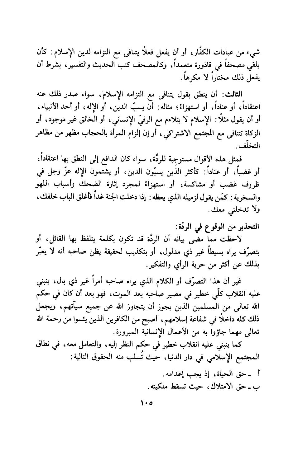 لاحظت مما مضي بيانه أن الردة قد تكون بكلمة يتلفظ بها القائل، أو بتصرف يراه بسيطاً غير ذي مدلول، أو بتكذيب لحقيقة يظن صاحبه أنه لا يعبر بذلك عن أكثر من حرية الرأي والتفكير.