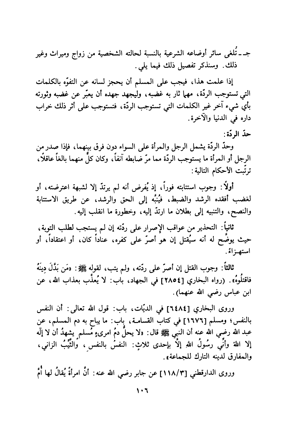 ثالثاً: وجوب القتل إن أصر على ردته، ولم يتب، لقوله - صلى الله عليه وسلم -: " من بدل دينه فاقتلوه ". (رواه البخاري [2854] في الجهاد، باب: لا يعذب بعذاب الله، عن ابن عباس رضي الله عنهما).