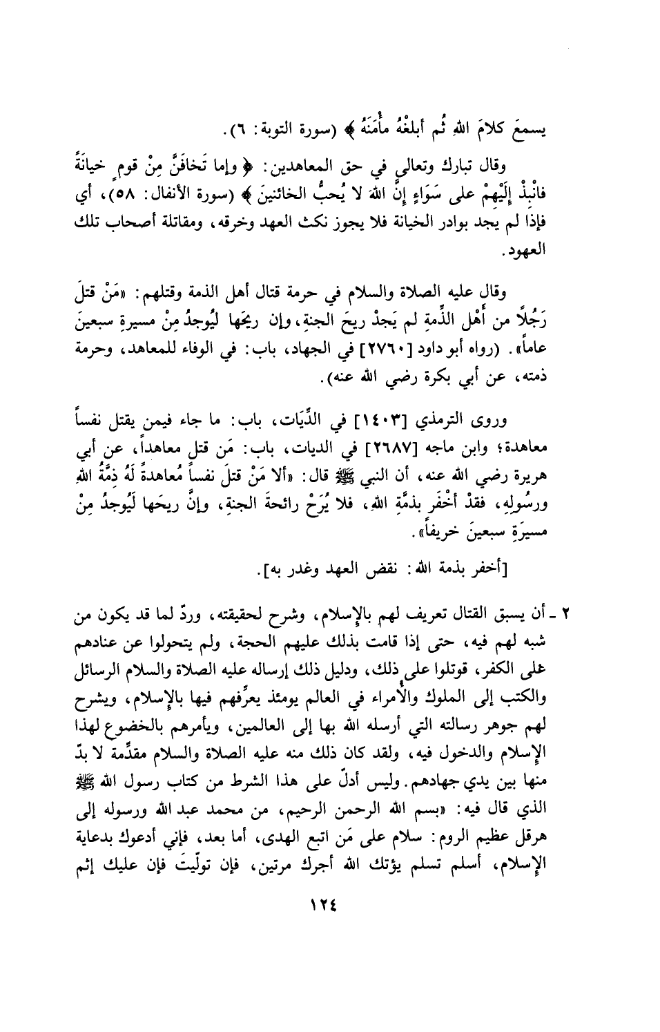 وقال عليه الصلاة والسلام في حرمة قتال أهل الذمة وقتلهم: {من قتل رجلاً من أهل الذمة لم يجد ريح الجنة، وإن ريحها ليوجد من مسيرة سبعين عاماً} (رواه أبو داود [2760] في الجهاد، باب: في الوفاء للمعاهد، وحرمة ذمته، عن أبي بكر رضي الله عنه).