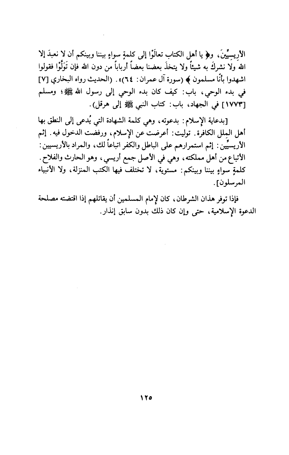 الأريسيين، و {يَا أَهْلَ الْكِتَابِ تَعَالَوْاْ إِلَى كَلَمَةٍ سَوَاء بَيْنَنَا وَبَيْنَكُمْ أَلاَّ نَعْبُدَ إِلاَّ اللهَ وَلاَ نُشْرِكَ بِهِ شَيْئاً وَلاَ يَتَّخِذَ بَعْضُنَا بَعْضاً أَرْبَاباً مِّن دُونِ اللهِ فَإِن تَوَلَّوْاْ فَقُولُواْ اشْهَدُواْ بِأَنَّا مُسْلِمُونَ} (سورة آل عمران: 64). (الحديث رواه البخاري [7] في بدء الوحي، باب: كيف كان بدء الوحي إلي رسول الله - صلى الله عليه وسلم - ومسلم [1773] في الجهاد، باب: كتاب النبي - صلى الله عليه وسلم - إلي هرقل).