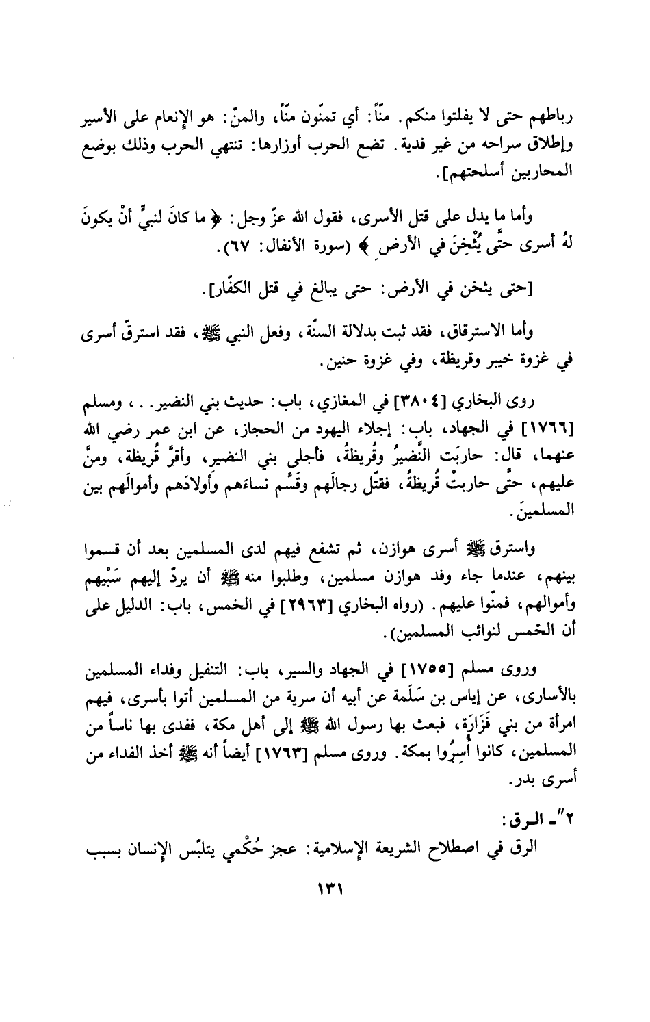 وروي مسلم [1755] في الجهاد والسير، باب: التنفيل وفداء المسلمين بالأسارى، عن إياس بن سلمة عن أبيه أن سرية من المسلمين أتوا بأسري، فيهم امرأة من بني فزارة، فبعث بها رسول الله - صلى الله عليه وسلم - إلي أهل مكة، ففدي بها ناساً من المسلمين، كانوا أسروا بمكة. وروي مسلم [1763] أيضاً أنه - صلى الله عليه وسلم - أخذ الفداء من أسري بدر.