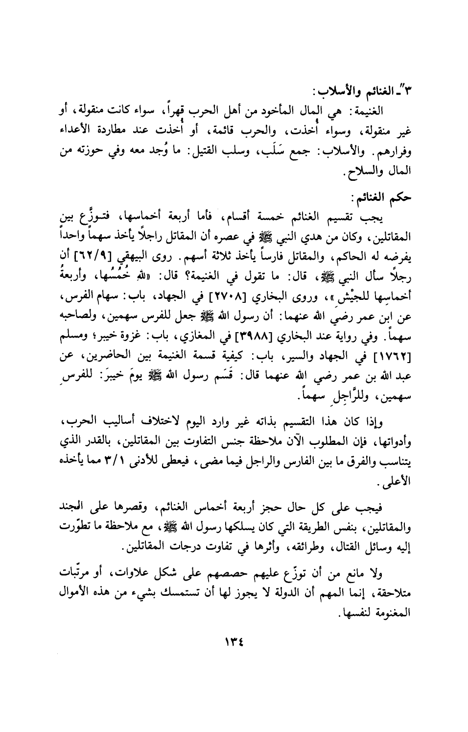 يجب تقسيم الغنائم خمسة أقسام، فأما أربعة أخماسهم، فتوزع بين المقاتلين، وكان من هدى النبي - صلى الله عليه وسلم - في عصره أن المقاتل راجلاً، يأخذ سهماً واحداً يفرضه له الحاكم، والمقاتل فارساً يأخذ ثلاثة أسهم. روي البيهقي [9/ 62] أن رجلاً سأل النبي - صلى الله عليه وسلم -، قال: ما تقول في الغنيمة؟ قال: " لله خمسها، وأربعة أخماسها للجيش " وروي البخاري [2708] في الجهاد، باب: سهام الفرس عن ابن عمر رضي الله عنهما: أن رسول الله $ جعل للفرس سهمين، ولصاحبه سهماً. وفي رواية عند البخاري [3988] في المغازي، باب: غزوة خيبر، ومسلم [1762] في الجهاد والسير، باب: كيفية قسمة الغنيمة بين الحاضرين، عن عبدالله بن عمر رضي الله عنهما قال: قسم رسول الله $ يوم خيبر: للفرس سهمين، وللراجل سهماً.