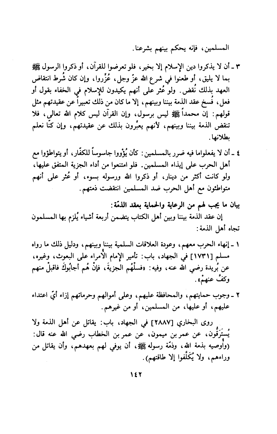 إن عقد الذمة بيننا وبين أهل الكتاب يتضمن أربعة أشياء يلزم بها المسلمون تجاه أهل الذمة: