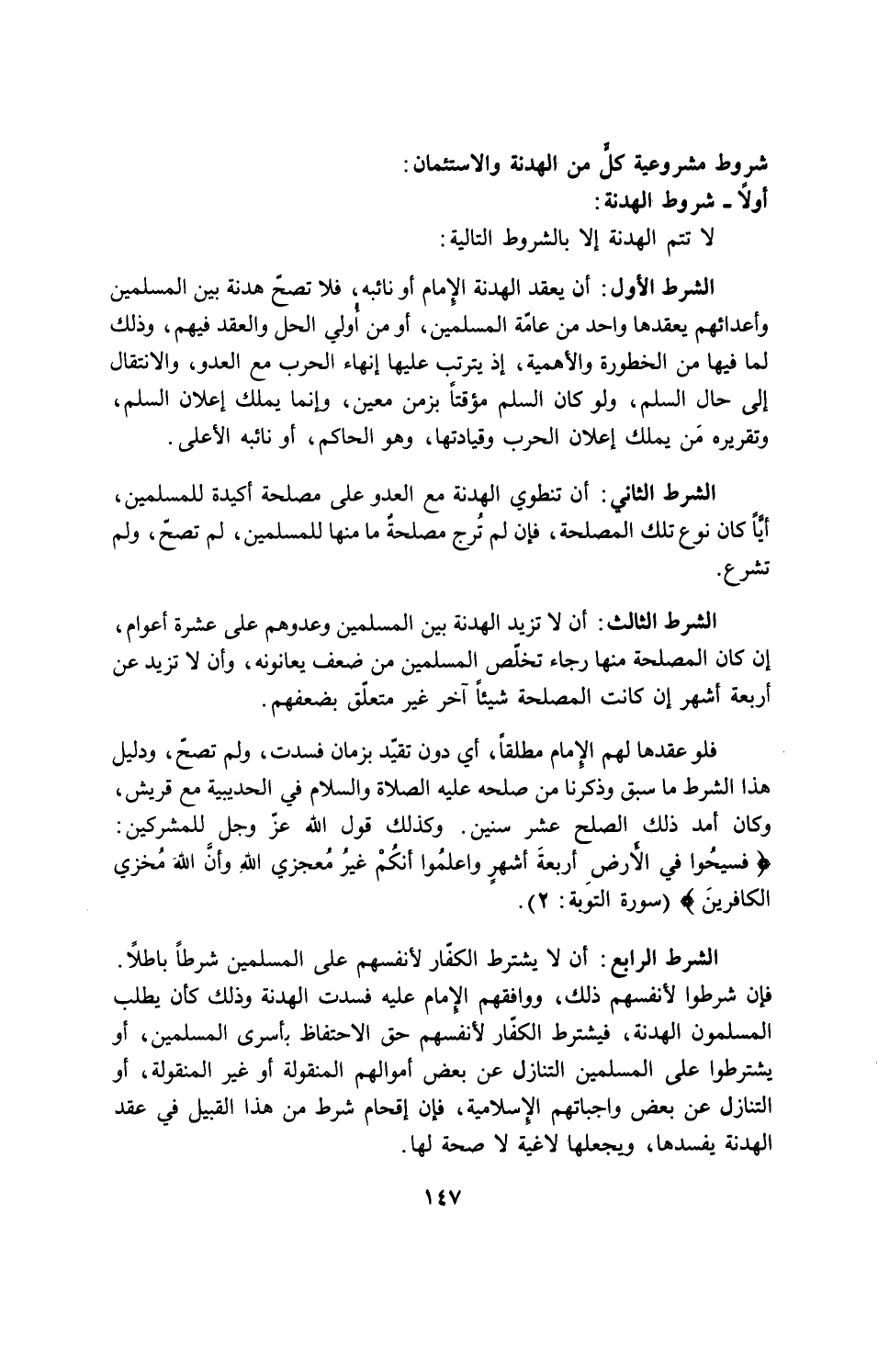 الشرط الثالث: أن لا تزيد الهدنة بين المسلمين وعدوهم على عشرة أعوام، إن كان المصلحة منها رجاء تخلص المسلمين من ضعف يعانونه، وأن لا تزيد عن أربعة أشهر إن كانت المصلحة شيئاً آخر غير متعلق بضعفهم.