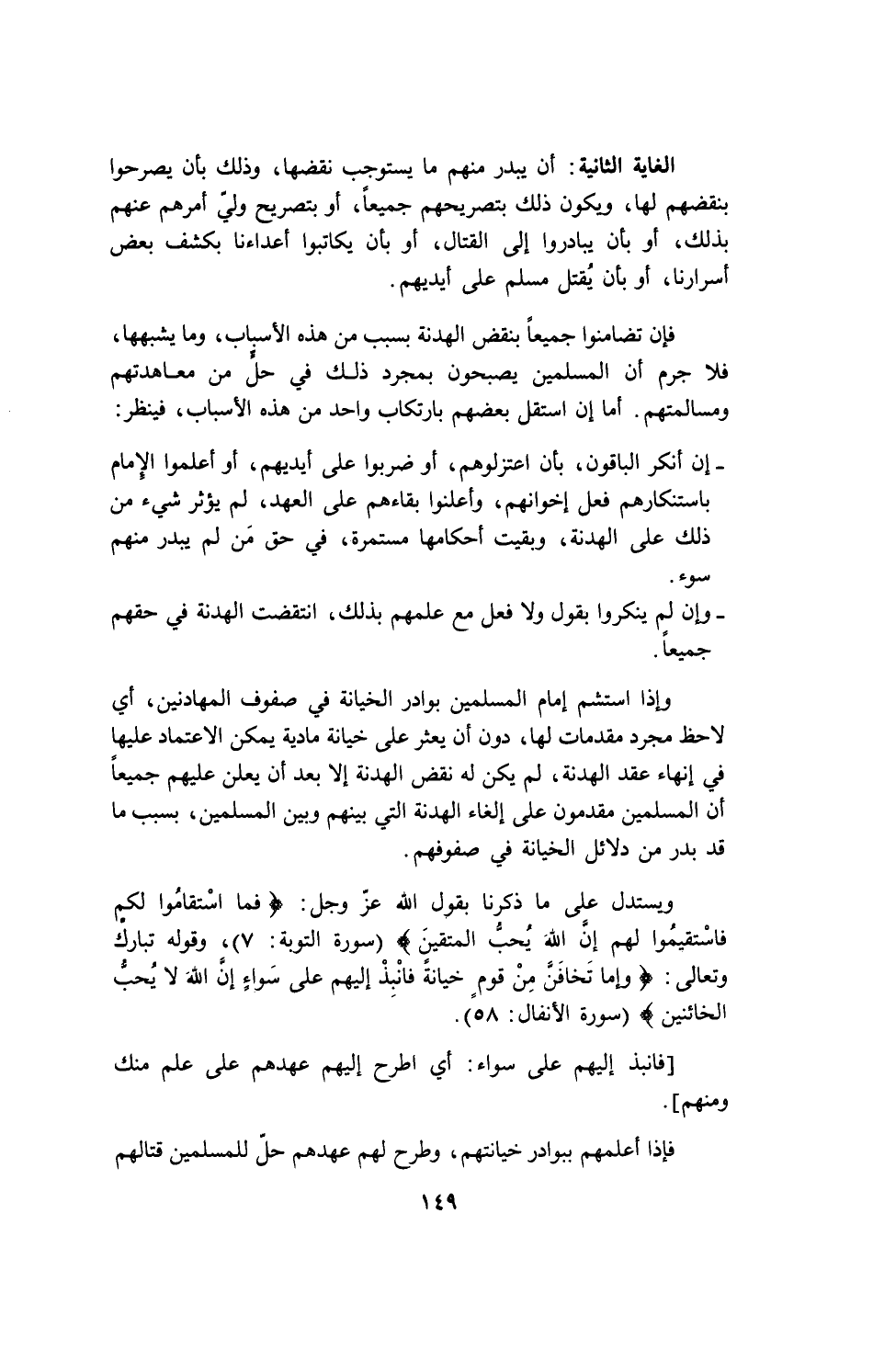 الغاية الثانية: أن يبدر منهم ما ستوجب نقضها، وذلك بان يصرحوا بنقضهم لها، ويكون ذلك بتصريحهم جميعاً، أو بتصريح ولي أمرهم عنهم بذلك أو بأن يبادروا إلي القتال، أو بأن يكاتبوا أعدائنا بكشف بعض أسرارنا، أو بأن يقتل مسلم على أيديهم.