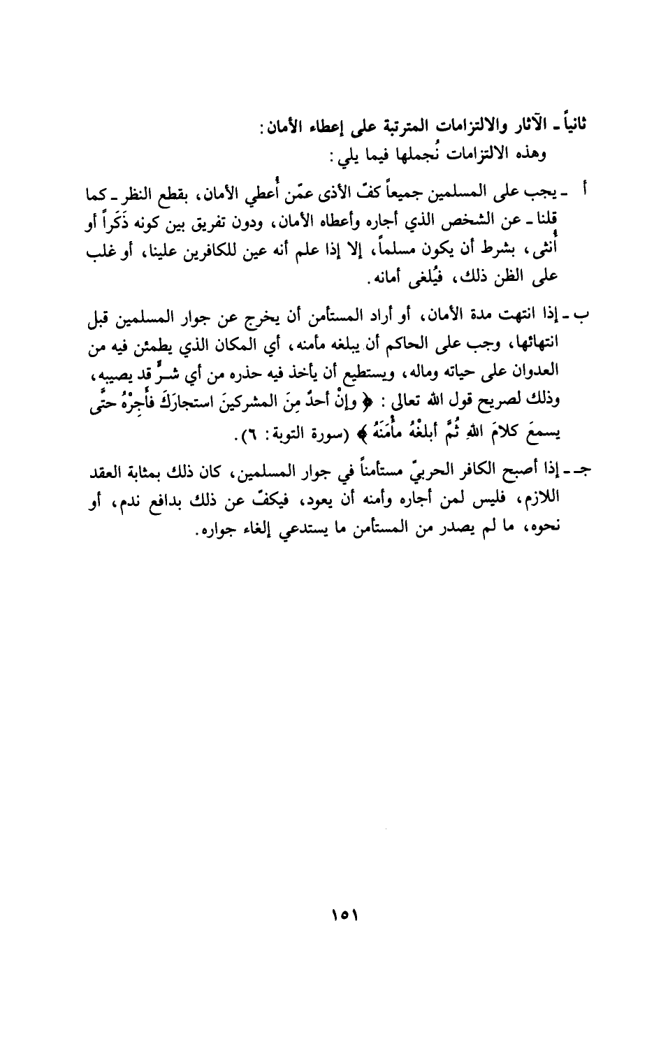 ب - إذا انتهت مدة الأمان، أو أراد المستأمن أن يخرج عن جوار المسلمين قبل انتهائها، وجب على الحاكم أن يبلغه مأمنه، أي المكان الذي يطمئن فيه من العدوان على حياته وماله، ويستطيع أن يأخذ فيه حذره من أي شر قد يصيبه، وذلك لصريح قول الله تعالي: {َإِنْ أَحَدٌ مِّنَ الْمُشْرِكِينَ اسْتَجَارَكَ فَأَجِرْهُ حَتَّى يَسْمَعَ كَلاَمَ اللهِ ثُمَّ أَبْلِغْهُ مَأْمَنَهُ ذَلِكَ بِأَنَّهُمْ قَوْمٌ لاَّ يَعْلَمُونَ} (سورة التوبة: 6).