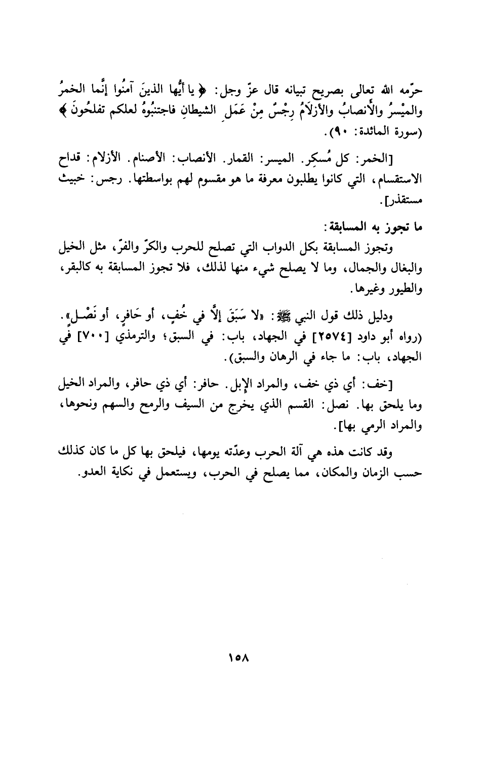 ودليل ذلك قول النبي - صلى الله عليه وسلم -: " لا سبق إلا في خف، او حافر، أو نصل " (رواه أبو داود [2574] في الجهاد، باب: في السبق، والترمذي [700] في الجهاد، باب: ما جاء في الرهان والسبق).