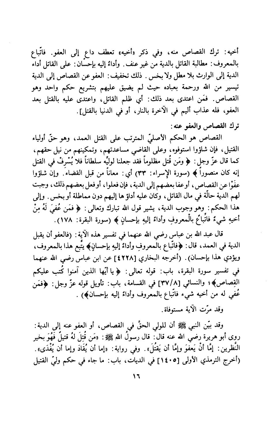 قال عبدالله بن عباس رضي الله عنهما في تفسير هذه الآية: (فالعفو أن يقبل الدية في العمد، قال: {فَاتِّبَاعٌ بِالْمَعْرُوفِ وَأَدَاء إِلَيْهِ بِإِحْسَانٍ} يتبع هذا بالمعروف، ويؤدي هذا بإحسان). (أخرجه البخاري [4228] عن ابن عباس رضي الله عنهما في تفسير سورة البقرة، باب: قوله تعالى: {يَا أَيُّهَا الَّذِينَ آمَنُواْ كُتِبَ عَلَيْكُمُ الْقِصَاصُ}؛ والنسائي [8/ 37] في القسامة، باب: تأويل قوله عز وجل: {َمَنْ عُفِيَ لَهُ مِنْ أَخِيهِ شَيْءٌ فَاتِّبَاعٌ بِالْمَعْرُوفِ وَأَدَاء إِلَيْهِ بِإِحْسَانٍ}).