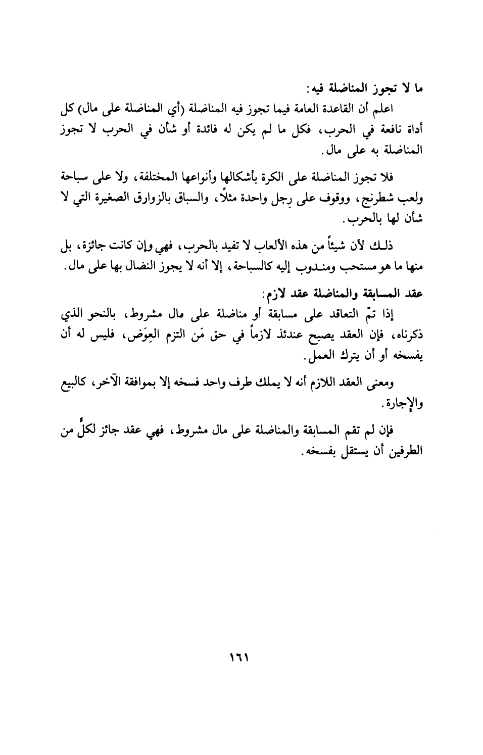 فلا تجوز المناضلة على الكرة بأشكالها وأنواعها المختلفة، ولا علي سباحة ولعب شطرنج، ووقوف على رجل واحدة مثلاً، والسباق الزوارق الصغيرة التي لا شأن لها بالحرب.