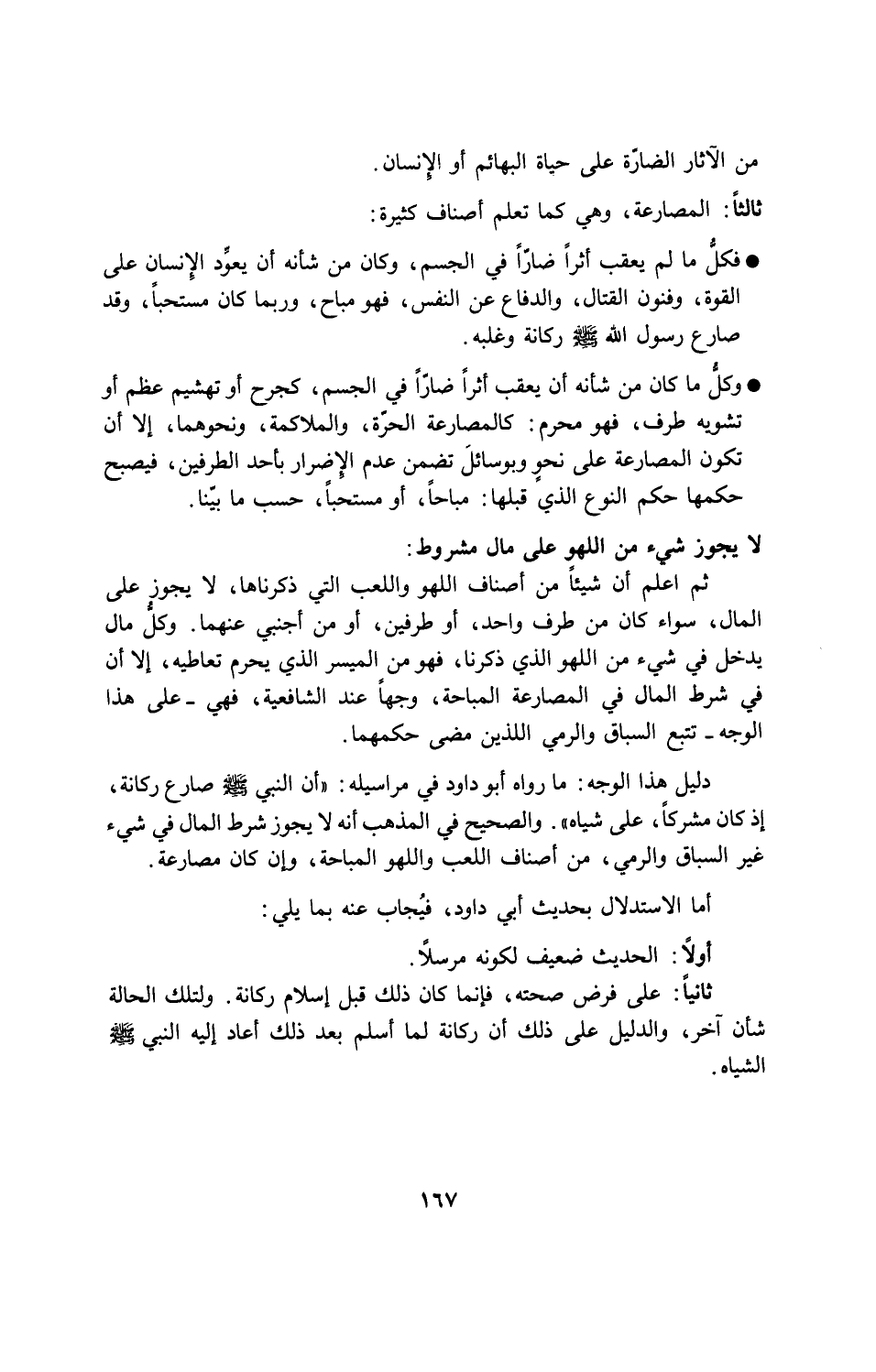 وكل ما كان من شأنه أن يعقب أثراً ضاراً في الجسم، كجرح أو تهشيم عظم أو تشويه طرف، فهو محرم: كالمصارعة الحرة، والملائكة، ونحوهما، إلا أن تكون المصارعة على نحو وبوسائل تضمن عدم الإضرار بأحد الطرفين، فيصبح حكمها حكم النوع الذي قبلها: مباحاً أو مستحباً، حسب ما بينا.
