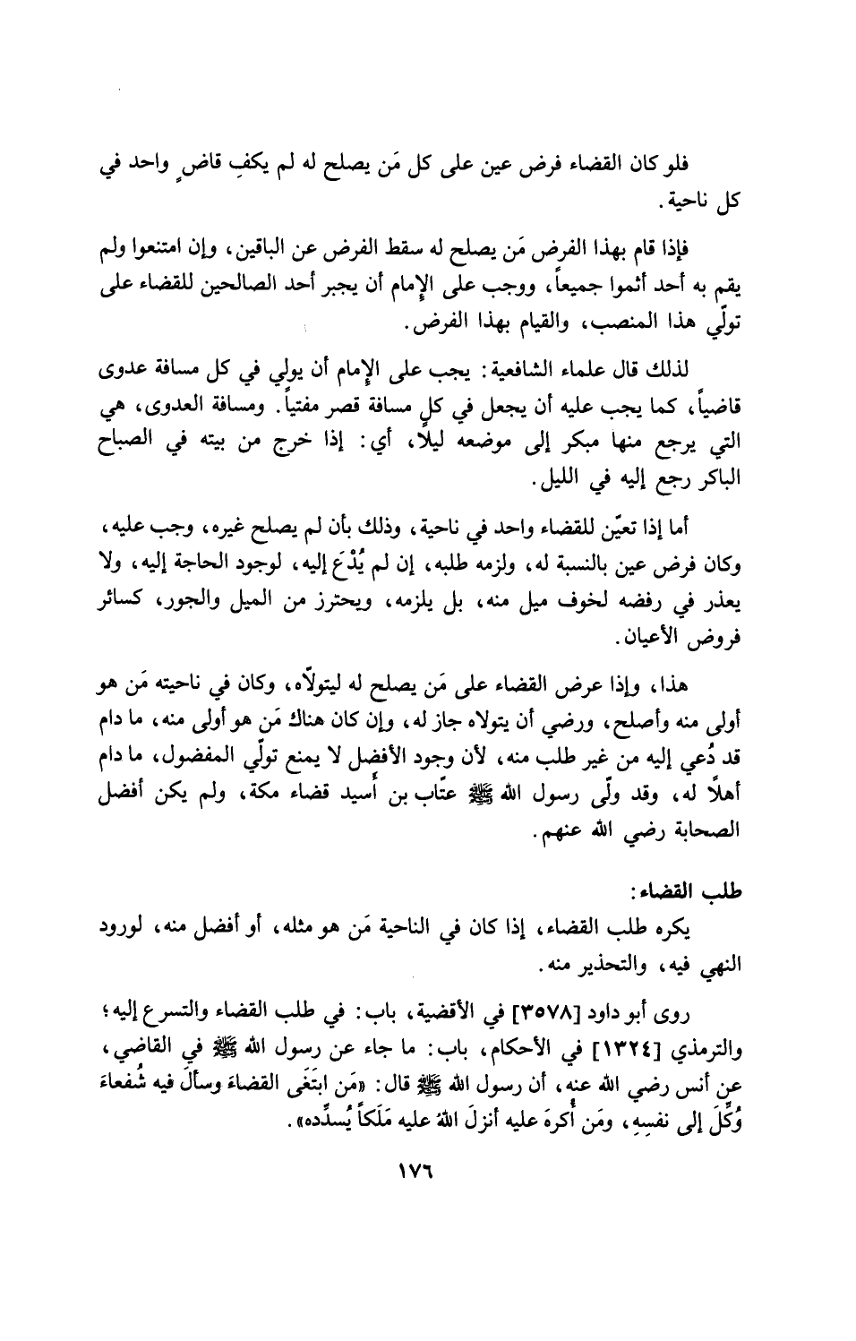 هذا، وإذا عرض القضاء على من يصلح له ليتولاه، وكان في ناحيته من هو أولي منه وأصلح، ورضي أن يتولاه جاز له، وإن كان هناك من هو أولي منه، ما دام قد دعي إليه من غير طلب منه، لأن وجود الأفضل لا يمنع تولي المفضول، ما دام أهلاً له ن وقد ولي رسول الله - صلى الله عليه وسلم - عتاب بن أسيد قضاء مكة، ولم يكن أفضل الصحابة رضي الله عنهم.