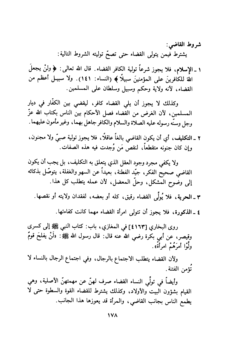 ولأن القضاء يتطلب الاجتماع بالرجال، وفي اجتماع الرجال بالنساء لا تؤمن الفتنة.