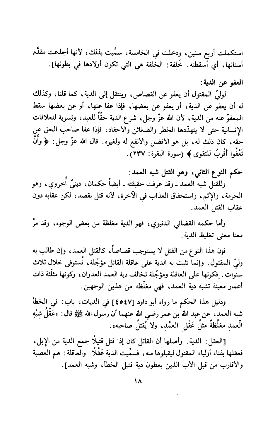 [العقل: الدية. وأصلها أن القاتل كان إذا قتل قتيلاً جمع الدية من الإبل، فعقلها بفناء أولياء المقتول ليقبلوها منه، فسميت الدية عقلاً. والعاقلة: هم العصبة والأقارب من قبل الأب الذين يعطون دية قتيل الخطأ، وشبه العمد].