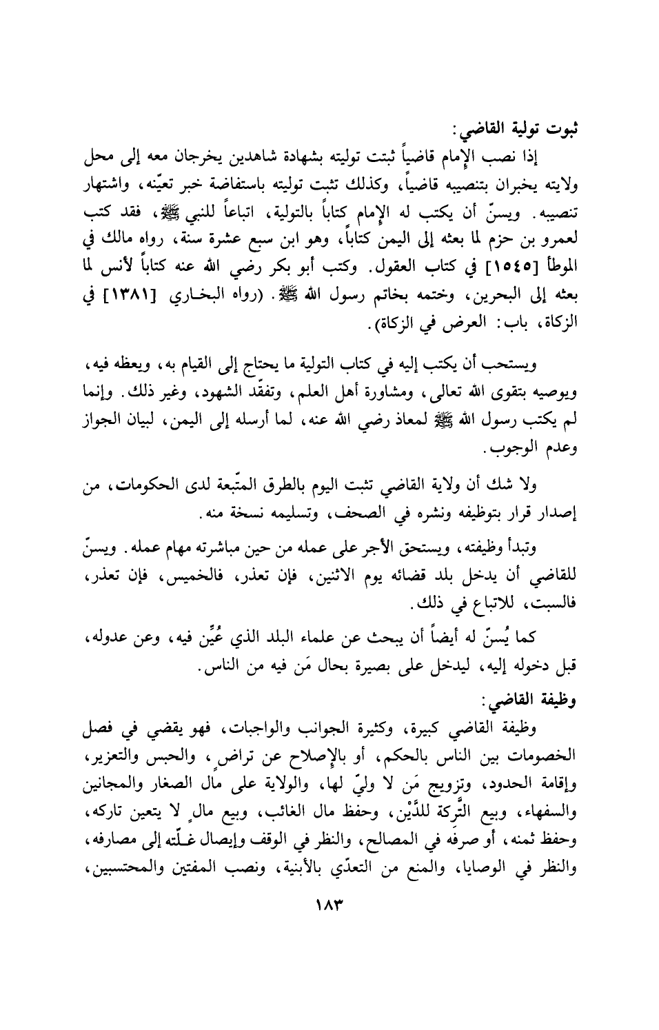 ويستحب أن يكتب إليه في كتاب التولية ما يحتاج إلي القيام به، ويعظه فيه ويوصيه بتقوى الله تعالى، ومشاورة أهل العلم، وتفقد الشهود، وغير ذلك وإنما لم يكتب رسول الله - صلى الله عليه وسلم - لمعاذ رضي الله عنه، لما أرسله إلي اليمن، لبيان الجواز وعدم الوجوب.