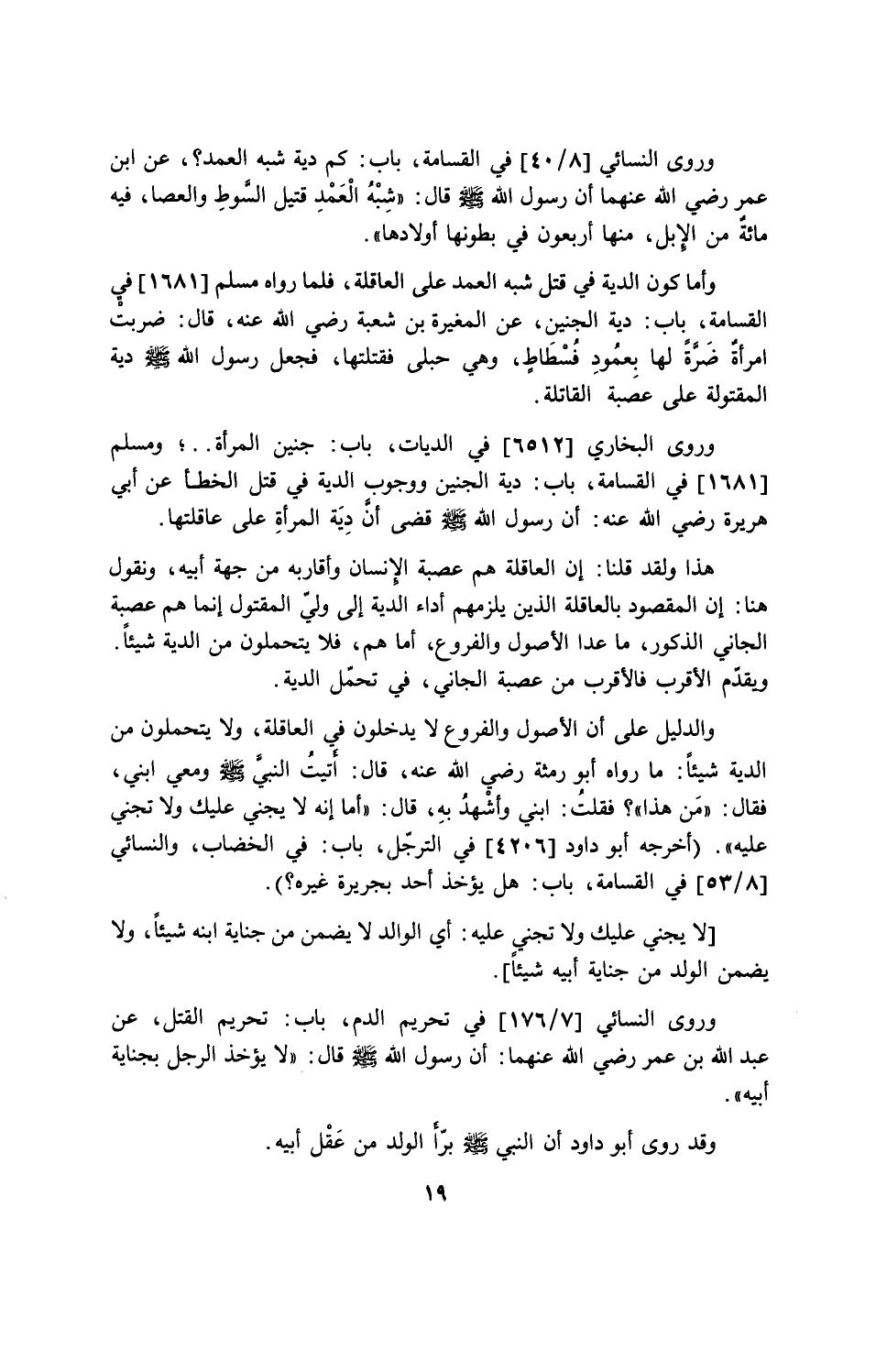 وروي النسائي [8/ 40] في القسامة، باب: كم دية شبه العمد؟، عن ابن عمر رضي الله عنهما أن رسول الله - صلى الله عليه وسلم - قال: " شبه العمد قتيل السوط والعصا، فيه مائة من الإبل، منها أربعون في بطونها أولادها".