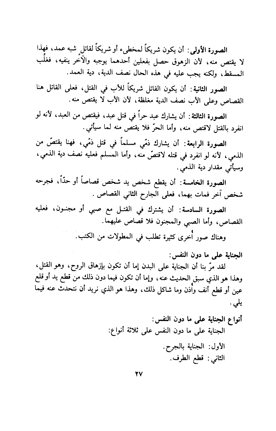 لقد مر بنا أن الجناية على البدن إما أن تكون بإزهاق الروح، وهو القتل، وهذا هو الذي سبق الحديث عنه، وإما أن تكون فيما دون ذلك من قطع يد أو قلع عين أو قطع أنف وأذن وما شاكل ذلك، وهذا هو الذي نريد أن نتحدث عنه فيما يلي: