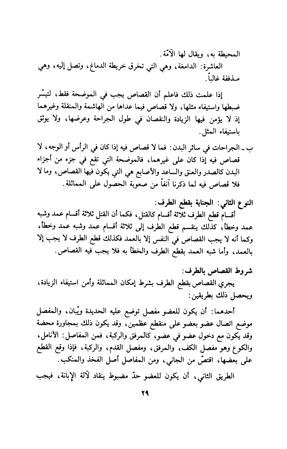 ب - الجراحات في سائر البدن: فما لا قصاص فيه إذا كان في الرأس أو الوجه، لا قصاص فيه إذا كان على غيرهما، فالموضحة التي تقع في جزء من أجزاء البدن كالصدر والعنق والساعد والأصابع هي التي يكون فيها القصاص، وما لا فلا قصاص فيه لما ذكرنا آنفاً من صعوبة الحصول على المماثلة.
