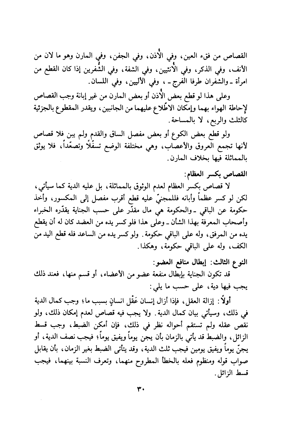 لا قصاص بكسر العظام لعدم الوثوق بالمماثلة، بل عليه الدية كما سيأتي، لكن لو كسر عظماً وأبانه فللمجني عليه قطع أقرب مفصل إلى المكسور، وأخذ حكومة عن الباقي ـ والحكومة هي مال مقدر على حسب الجناية يقدره الخبراء وأصحاب المعرفة بهذا الشأن ـ وعلى هذا فلو كسر يده من العضد كان له أن يقطع يده من المرفق، وله على الباقي حكومة. ولو كسر يده من الساعد فله قطع اليد من الكف، وله على الباقي حكومة، وهكذا.