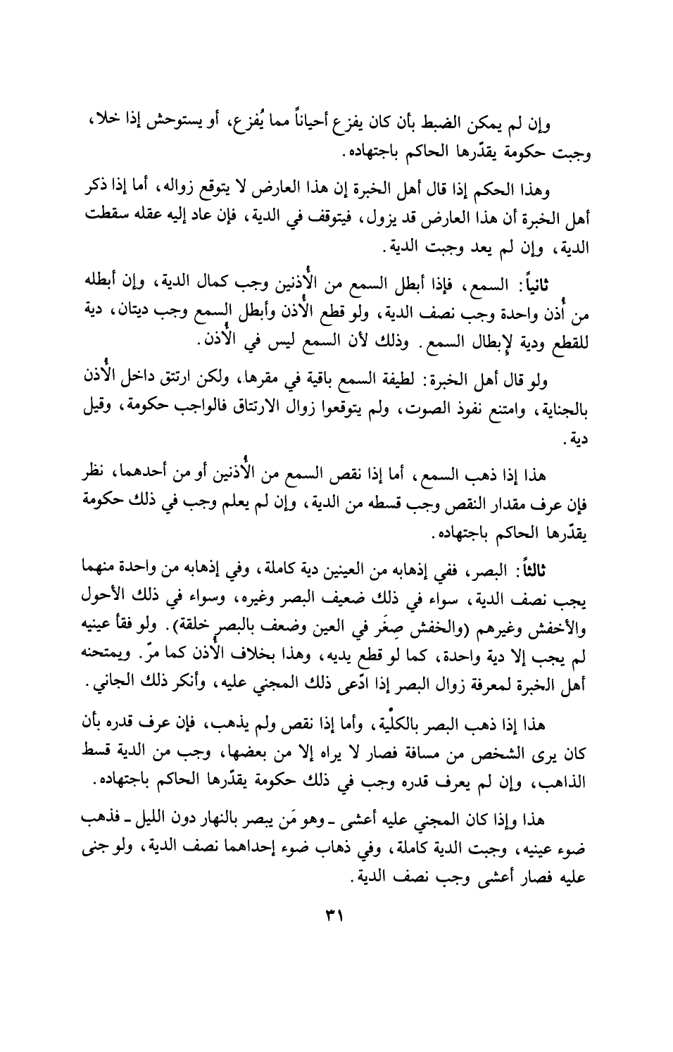 ثالثاً: البصر، ففي إذهابه من العينين دية كاملة، وفي إذهابه من واحدة منهما يجب نصف الدية، سواء في ذلك ضعيف البصر وغيره، وسواء في ذلك الأحول والأخفش وغيرهم (والخفش صغر في العين وضعف البصر خلقة). ولو فقأ عينيه لم يجب إلا دية واحدة، كما لو قطع يديه، وهذا بخلاف الأذن كما مر. ويمتحنه أهل الخبرة لمعرفة زوال البصر إذا ادعي ذلك المجني عليه، وأنكر ذلك الجاني.