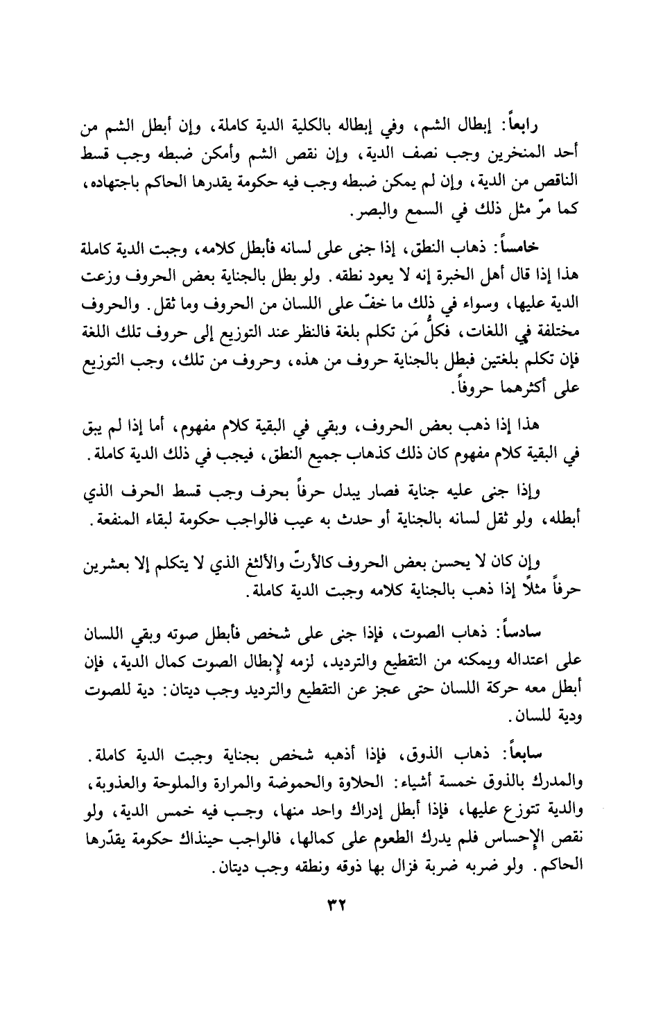 خامساً: ذهاب النطق، إذا جنى على لسانه فأبطل كلامه، وجبت الدية كاملة هذا إذا قال أهل الخبرة إنه لا يعود نطقه. ولو بطل بالجناية بعض الحروف وزعت الدية عليها، وسواء في ذلك ما خف على اللسان من الحروف وما ثقل. والحروف مختلفة في اللغات، فكل من تكلم بلغة فالنظر عند التوزيع إلي حروف تلك اللغة فإن تكلم بلغتين فبطل بالجناية حروف من هذه، وحروف من تلك، وجب التوزيع على أكثرهما حروفاً.