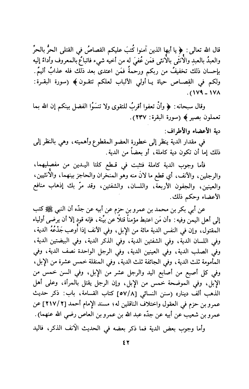 قال الله تعالى: {يَا أَيُّهَا الَّذِينَ آمَنُواْ كُتِبَ عَلَيْكُمُ الْقِصَاصُ فِي الْقَتْلَى الْحُرُّ بِالْحُرِّ وَالْعَبْدُ بِالْعَبْدِ وَالأُنثَى بِالأُنثَى فَمَنْ عُفِيَ لَهُ مِنْ أَخِيهِ شَيْءٌ فَاتِّبَاعٌ بِالْمَعْرُوفِ وَأَدَاء إِلَيْهِ بِإِحْسَانٍ ذَلِكَ تَخْفِيفٌ مِّن رَّبِّكُمْ وَرَحْمَةٌ فَمَنِ اعْتَدَى بَعْدَ ذَلِكَ فَلَهُ عَذَابٌ أَلِيمٌ. وَلَكُمْ فِي الْقِصَاصِ حَيَاةٌ يَاْ أُولِيْ الأَلْبَابِ لَعَلَّكُمْ تَتَّقُونَ} (سورة البقرة: 178 - 179).