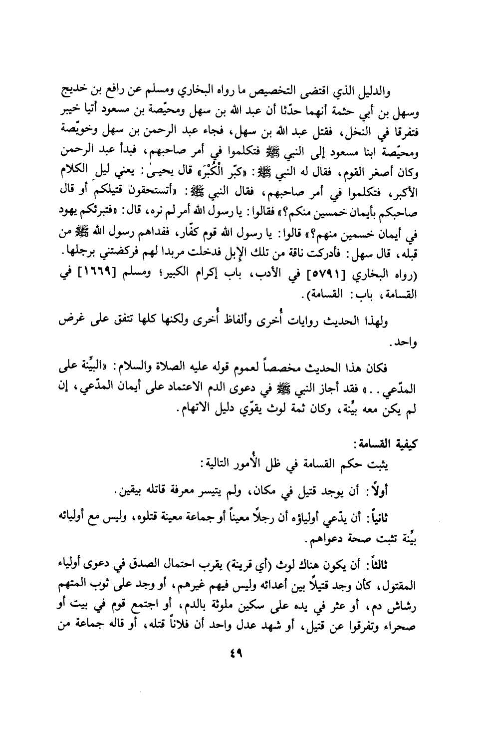 فكان هذا الحديث مخصصاً لعموم قوله عليه الصلاة والسلام: "البينة على المدعي. . " فقد أجاز النبي - صلى الله عليه وسلم - في دعوى الدم الاعتماد على أيمان المدعي، إن لم يكن معه بينة، وكان ثمة لوث يقوي دليل الاتهام.