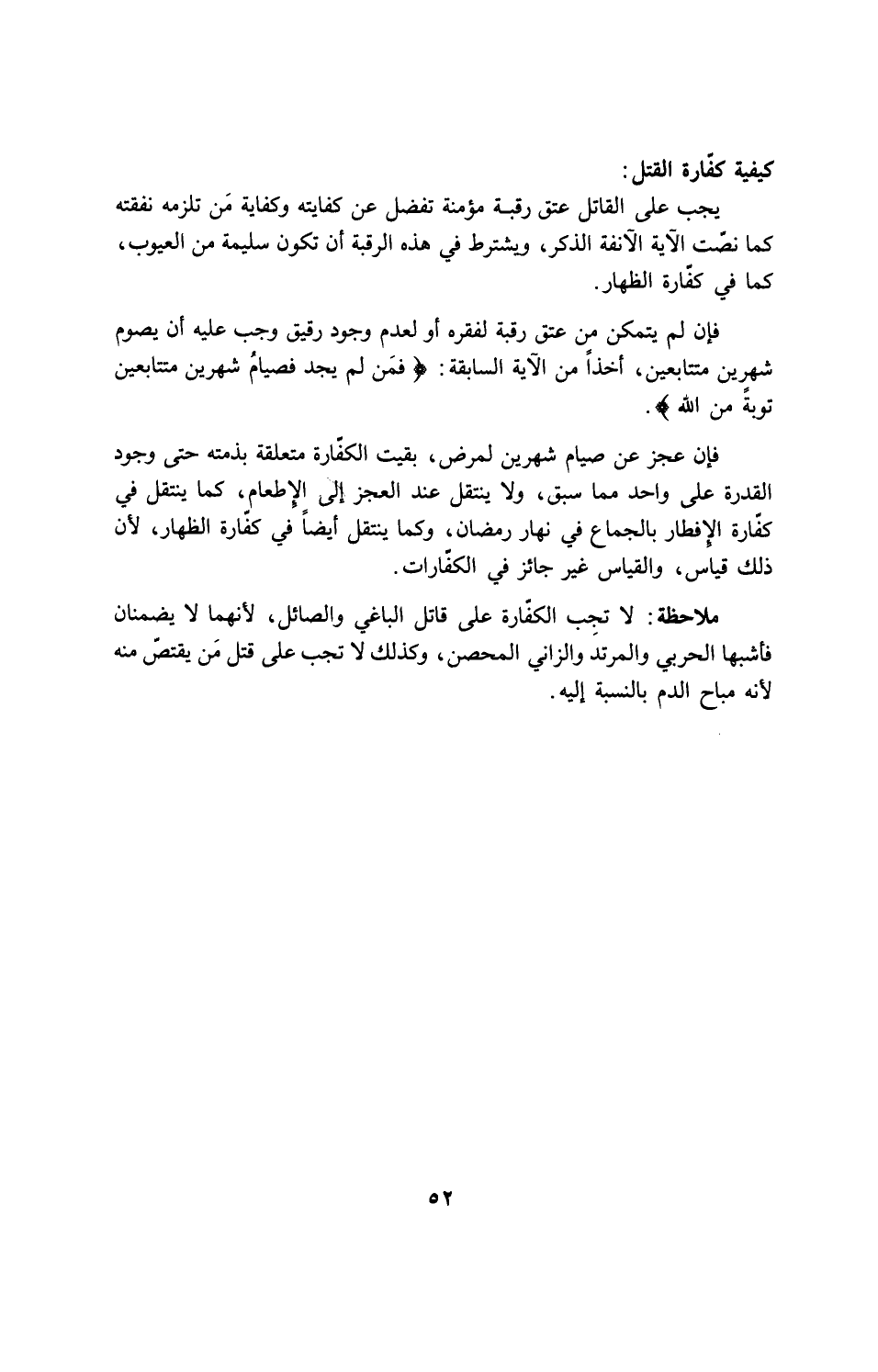 ملاحظة: لا تجب الكفارة على قاتل الباغي والصائل، لأنها لا يضمنان فأشبها الحربي والمرتد والزاني المحصن، وكذلك لا تجب على قتل من يقتص منه لأنه مباح الدم بالنسبة إليه.