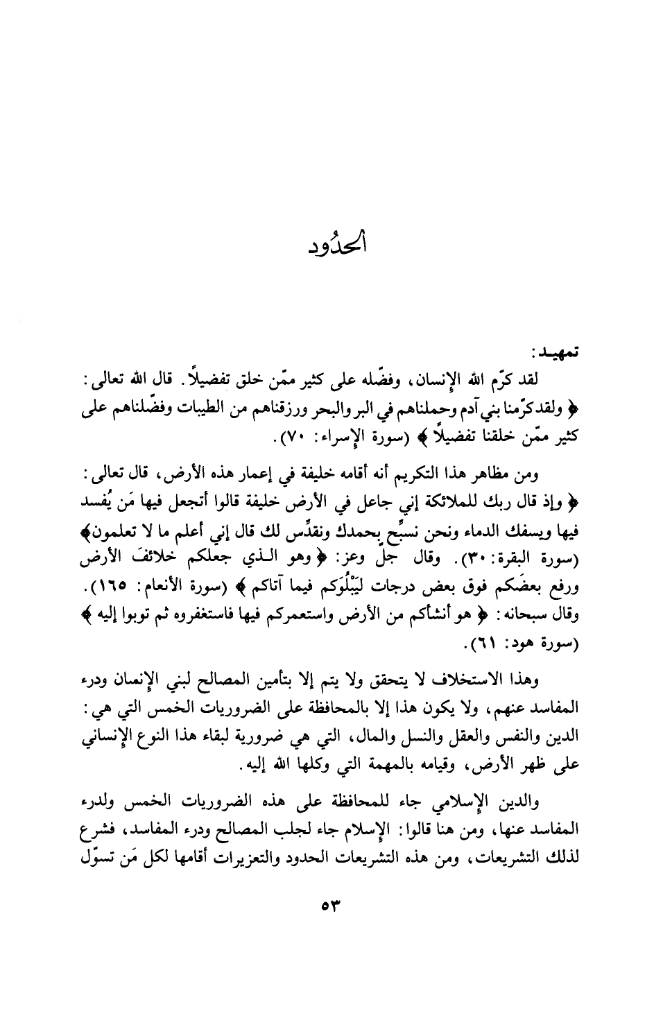 والدين الإسلامي جاء للمحافظة على هذه الضروريات الخمس ولدرء المفاسد عنها، ومن هنا قالوا: الإسلام جاء لجلب المصالح ودرء المفاسد، فشرع لذلك التشريعات، ومن هذه التشريعات الحدود والتعزيرات أقامها لكل من تسول