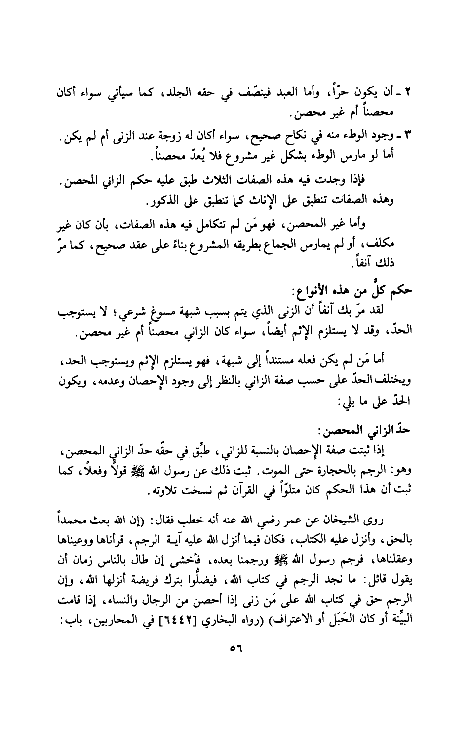 روى الشيخان عن عمر رضي الله عنه أنه خطب فقال: (إن الله بعث محمداً بالحق، وأنزل عليه الكتاب، فكان فيما أنزل الله عليه آية الرجم، قرأناها ووعيناها وعقلناها، فرجم رسول الله - صلى الله عليه وسلم - ورجمنا بعده، فأخشى إن طال بالناس زمان أن يقول قائل: ما نجد الرجم في كتاب الله، فيضلوا بترك فريضة أنزلها الله، وإن الرجم حق في كتاب الله على من زنى إذا أحصن من الرجال والنساء، إذا قامت البينة أو كان الحبل أو الاعتراف) (رواه البخاري [6442] في المحاربين، باب: