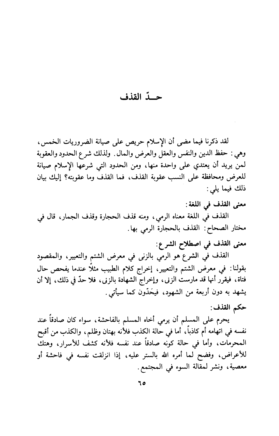 لقد ذكرنا فيما مضى أن الإسلام حريص على صيانة الضروريات الخمس، وهي: حفظ الدين والنفس والعقل والعرض والمال. ولذلك شرع الحدود والعقوبة لمن يريد أن يعتدي على واحدة منها، ومن الحدود التي شرعها الإسلام صيانة للعرض ومحافظة على النسب عقوبة القذف، فما القذف وما عقوبته؟ إليك بيان ذلك فيما يلي: