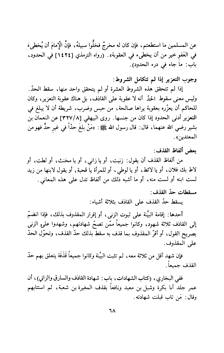إذا لم تتحقق هذه الشروط العشرة أو لم يتحقق واحد منها، سقط الحد. وليس معنى سقوط الحد أنه لا عقوبة على القاذف، بل هناك عقوبة التعزير، وكان للحاكم أن يعزره بعقوبة يراها صالحة، من حبس وضرب، شريطة أن لا يبلغ في التعزير أدنى الحدود إذا كان من جنسها. روى البيهقي [8/ 327] عن النعمان بن بشير رضي الله عنهما، قال: قال رسول الله - صلى الله عليه وسلم -: " من بلغ حداً في غير حد فهو من المعتدين".
