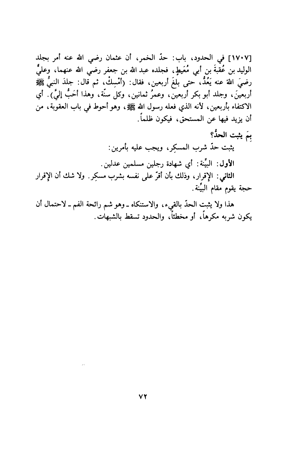 [1707] في الحدود، باب: حدد الخمر، أن عثمان رضي الله عنه أمر بجلد الوليد بن ابي معيط، فجلده عبدالله بن جعفر رضي الله عنهما، وعلي رضي الله عنه يعد، حتى بلغ أربعين، فقال: (أمسك، ثم قال: جلد النبي - صلى الله عليه وسلم - أربعين، وجلد أبو بكر أربعين، وعمر ثمانين، وكل سنة، وهذا أحب إلى). أي الاكتفاء بأربعين، لأنه الذي فعله رسول الله - صلى الله عليه وسلم -، وهو أحوط في باب العقوبة، من أن يزيد فيها عن المستحق، فيكون ظلماً.