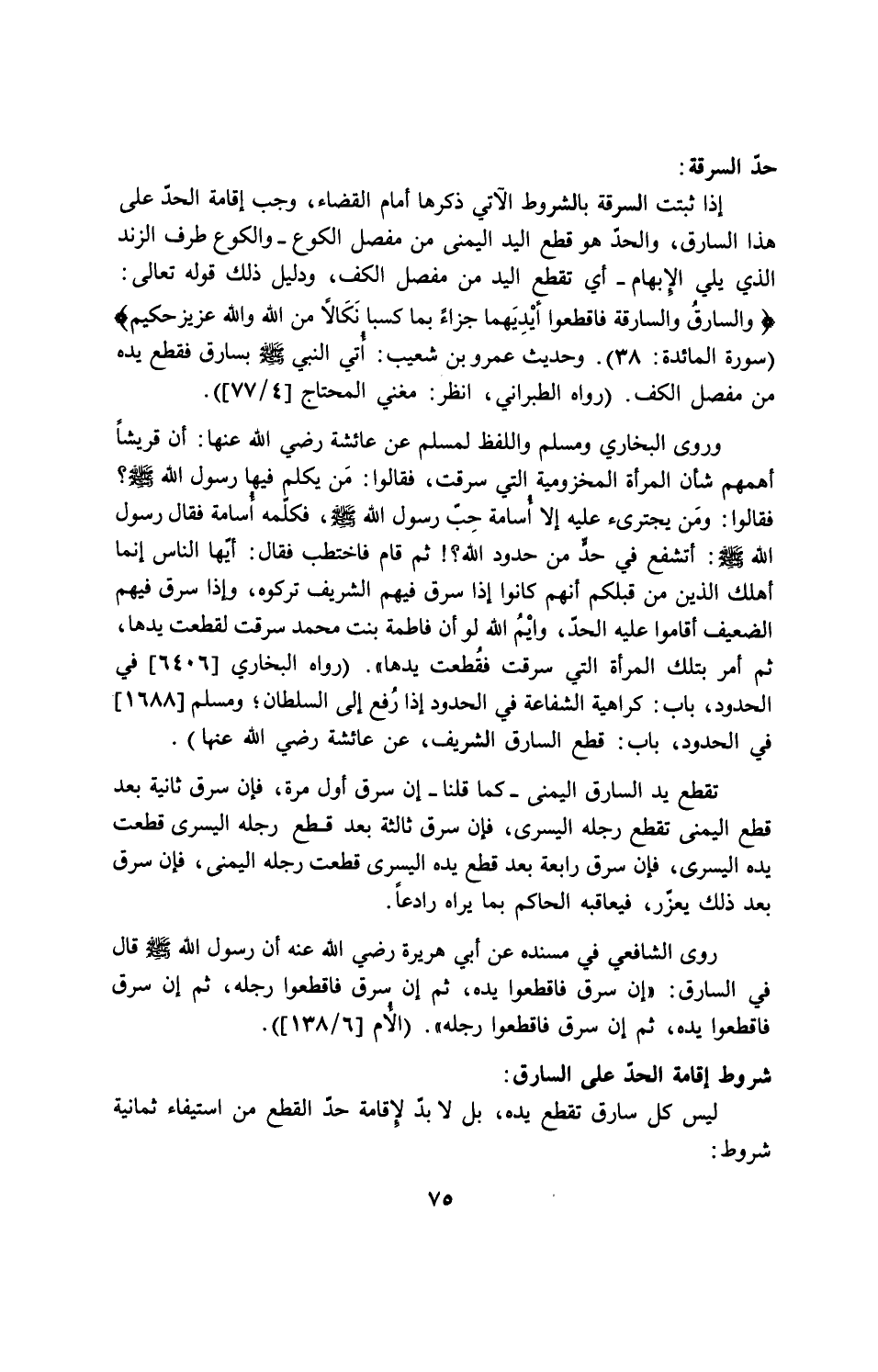 إذا ثبتت السرقة بالشروط الآتي ذكرها أمام القضاء، وجب إقامة الحد على هذا السارق، والحد هو قطع اليد من مفصل الكوع ـ والكوع طرف الزند الذي يلي الإبهام ـ أي تقطع اليد من مفصل الكف، ودليل ذلك قوله تعالى:: {وَالسَّارِقُ وَالسَّارِقَةُ فَاقْطَعُواْ أَيْدِيَهُمَا جَزَاء بِمَا كَسَبَا نَكَالاً مِّنَ اللهِ وَاللهُ عَزِيزٌ حَكِيمٌ} (سورة المائدة: 38). وحديث عمرو بن شعيب: أتي النبي - صلى الله عليه وسلم - بسارق فقطع يده من مفصل الكف. (رواه الطبراني، انظر: مغني المحتاج [4/ 77]).